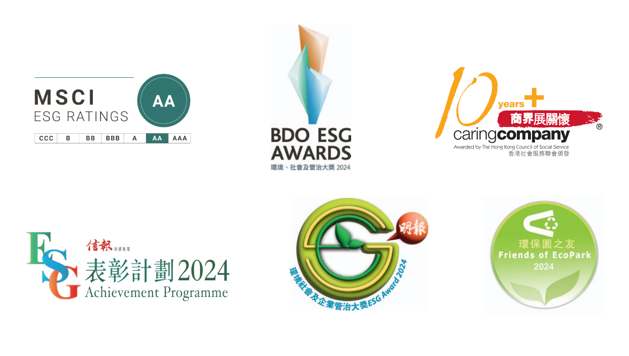 • 「BDO環境、社會及管治大獎2024」— ESG年度大獎 — 大市值」、「ESG最佳表現大獎 — 大市值」、「最佳ESG報告大獎 — 大市值」和「主題大獎優異獎」